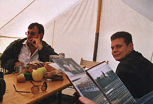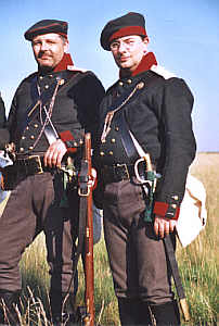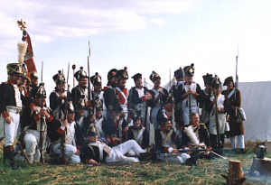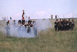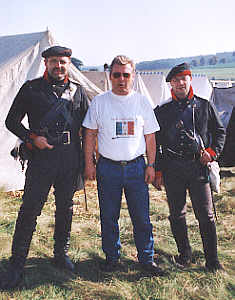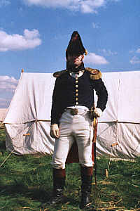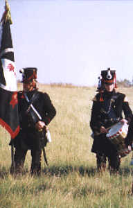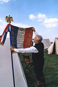 Clubmitglied Achim als schneidiger französischer Offizier Bild Rechts: Extra für mich entfaltet ein französischer Offizier diese herrliche Fahne. Wie stellen fest, dass ich fast dasselbe Motiv auf meinem T-Shirt habe. Hier - dem 2.Regiment, bei mir - dem 1.Regiment - der Kaisergarde natürlich auf beiden Fahnen |